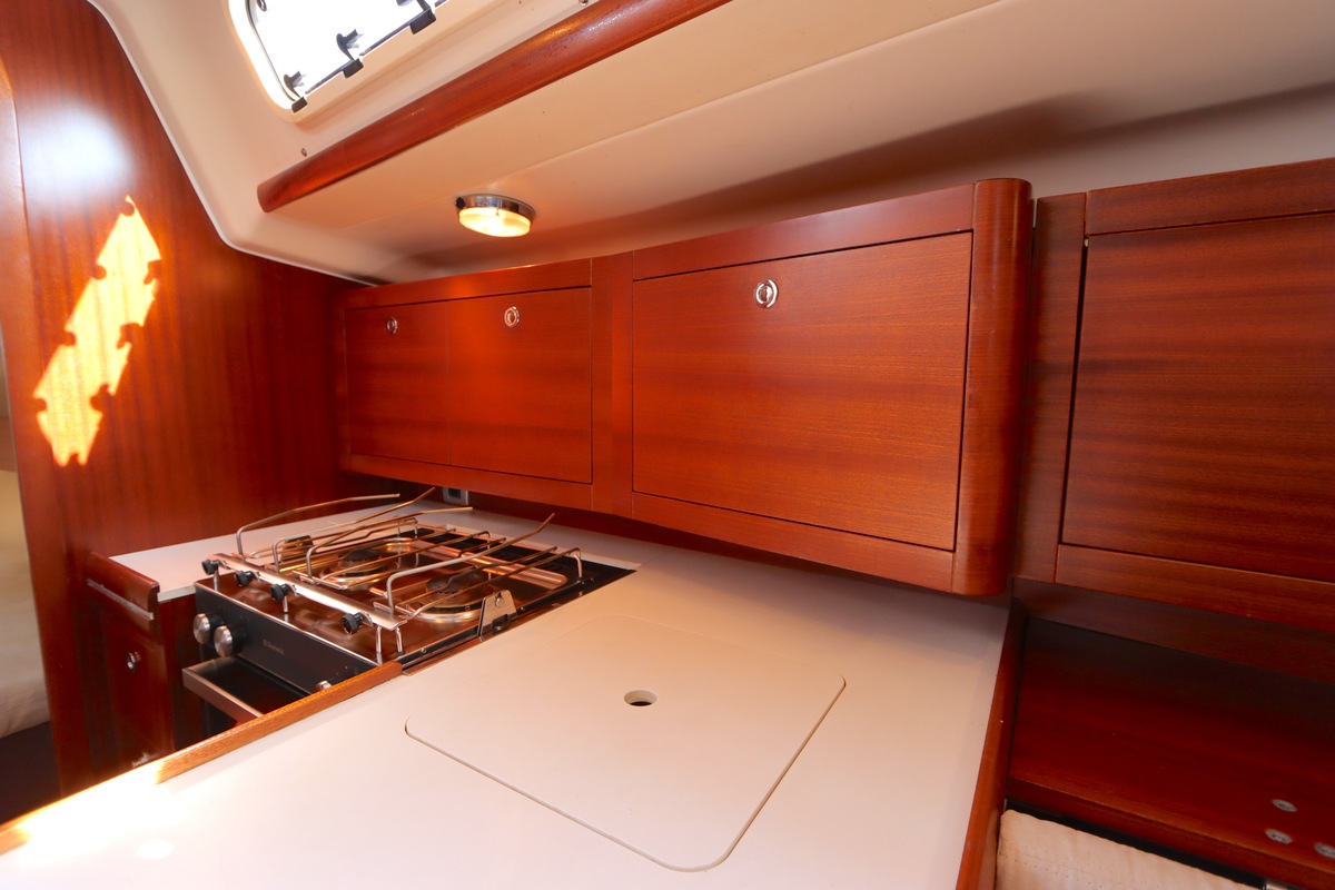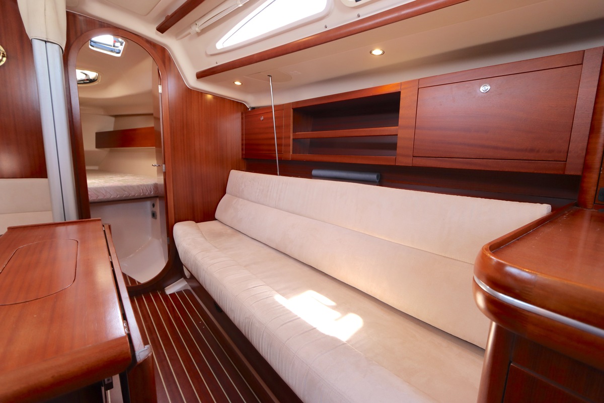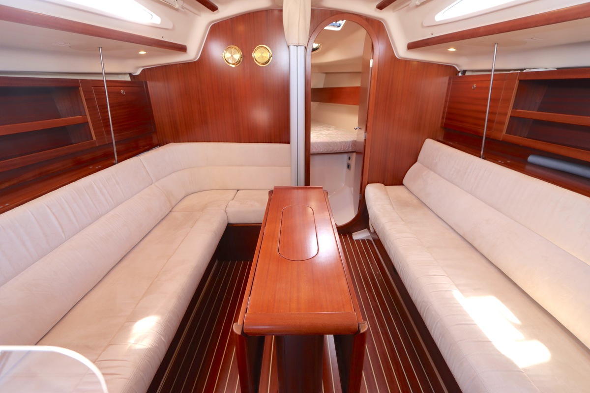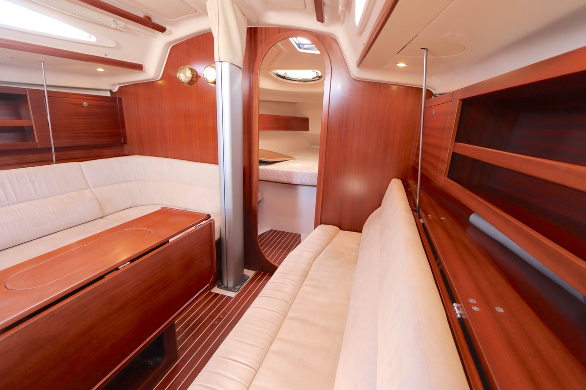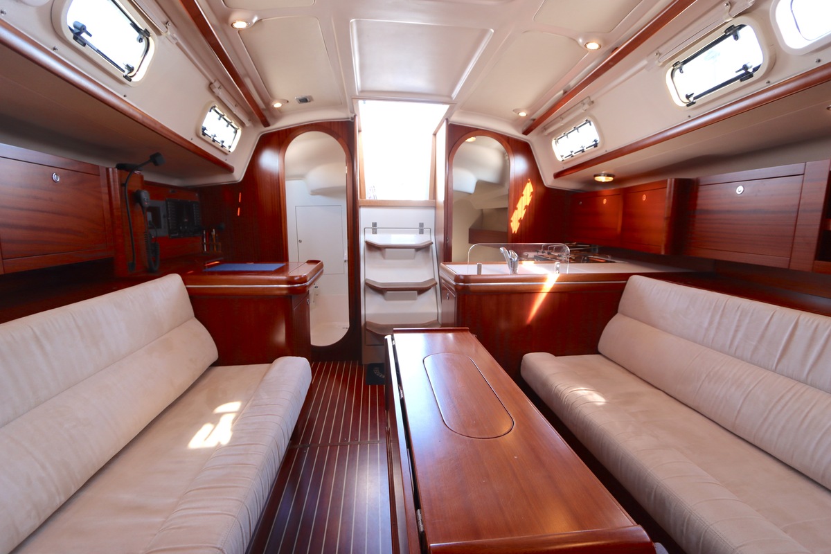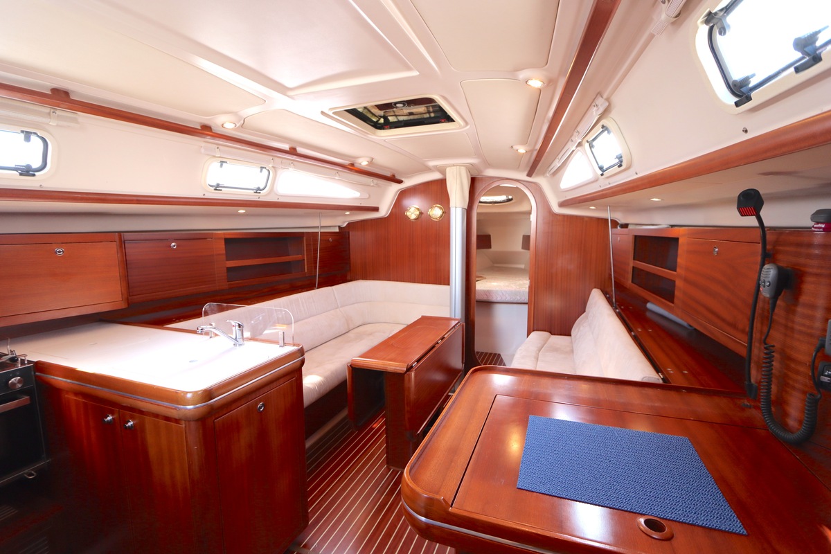 Der Innenraum ist geräumig und geschickt aufgeteilt, mit warmen Holzoberflächen und viel natürlichem Licht. Die Kabine bietet bequeme Kojen, eine gut ausgestattete Kombüse und einen gemütlichen Salon, was längere Reisen angenehm und praktisch macht.