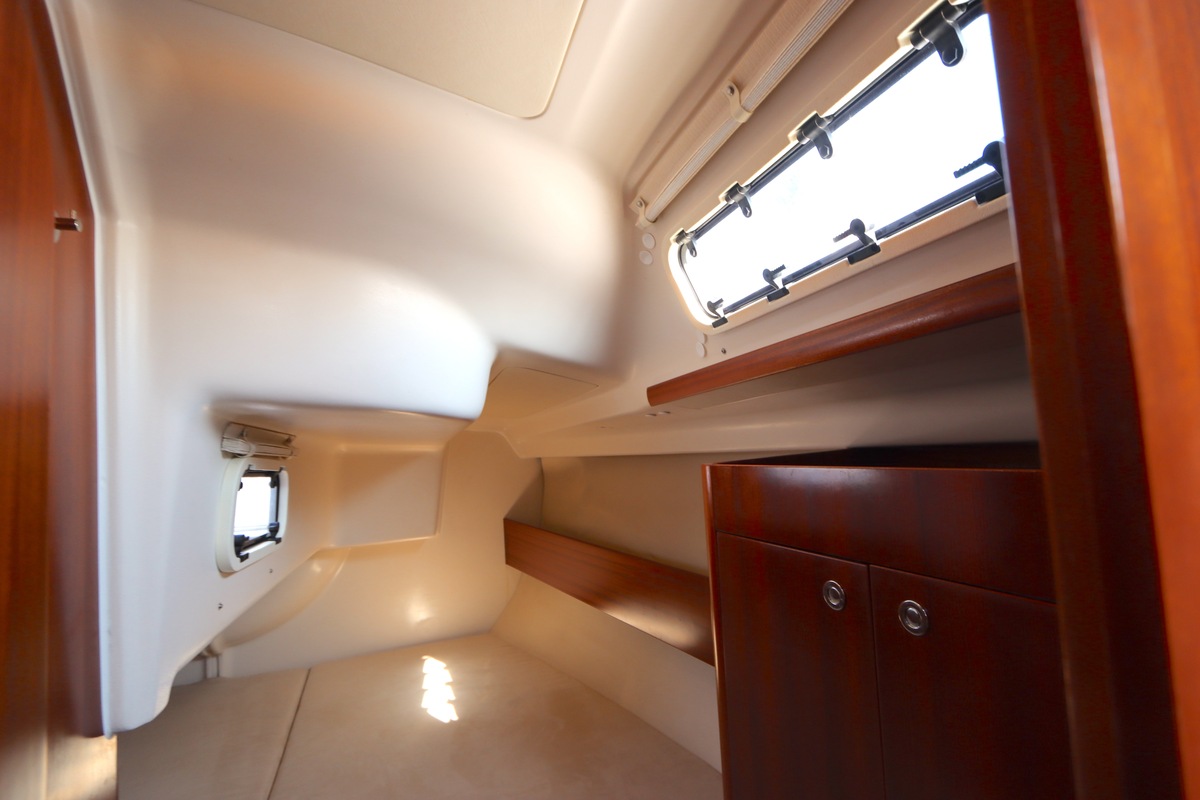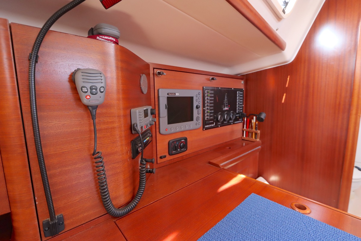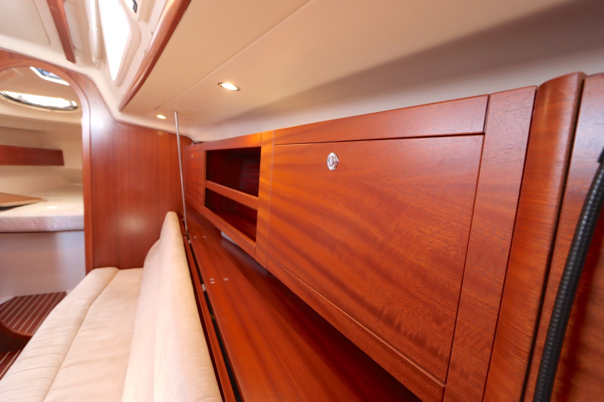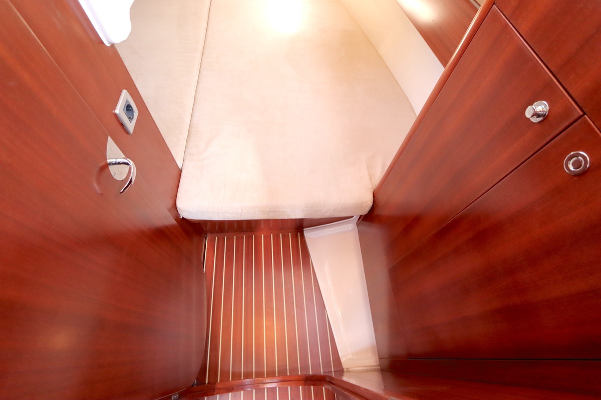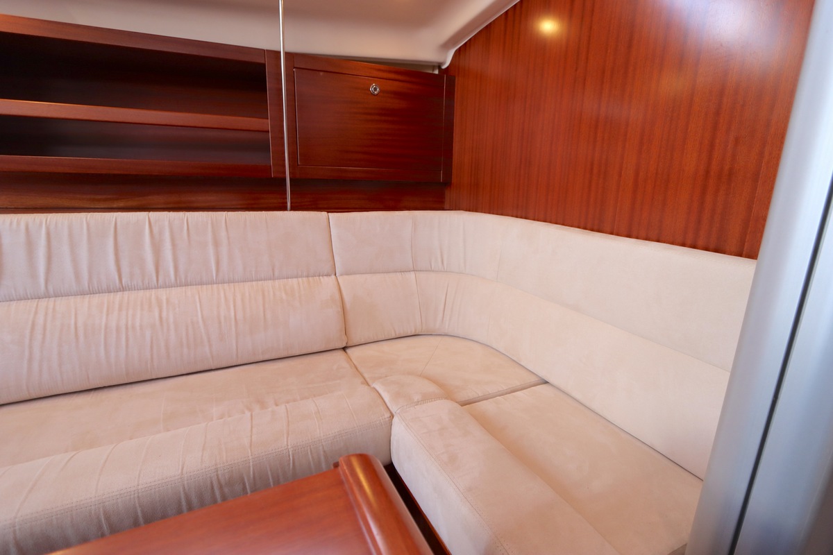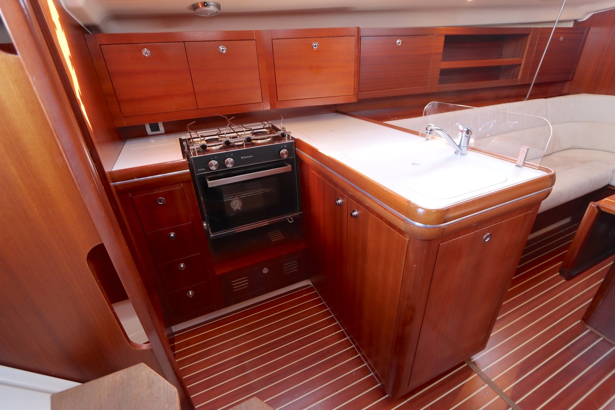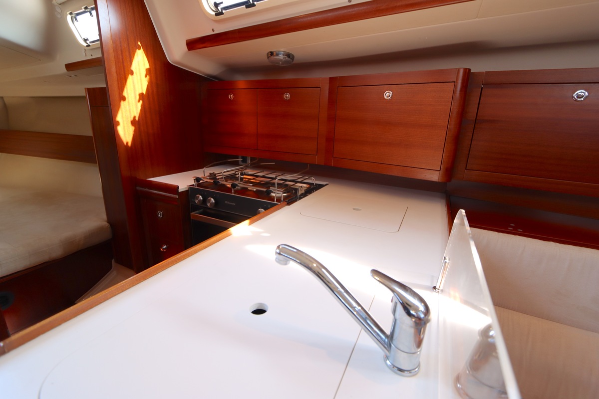 Der Innenraum ist geräumig und geschickt aufgeteilt, mit warmen Holzoberflächen und viel natürlichem Licht. Die Kabine bietet bequeme Kojen, eine gut ausgestattete Kombüse und einen gemütlichen Salon, was längere Reisen angenehm und praktisch macht.