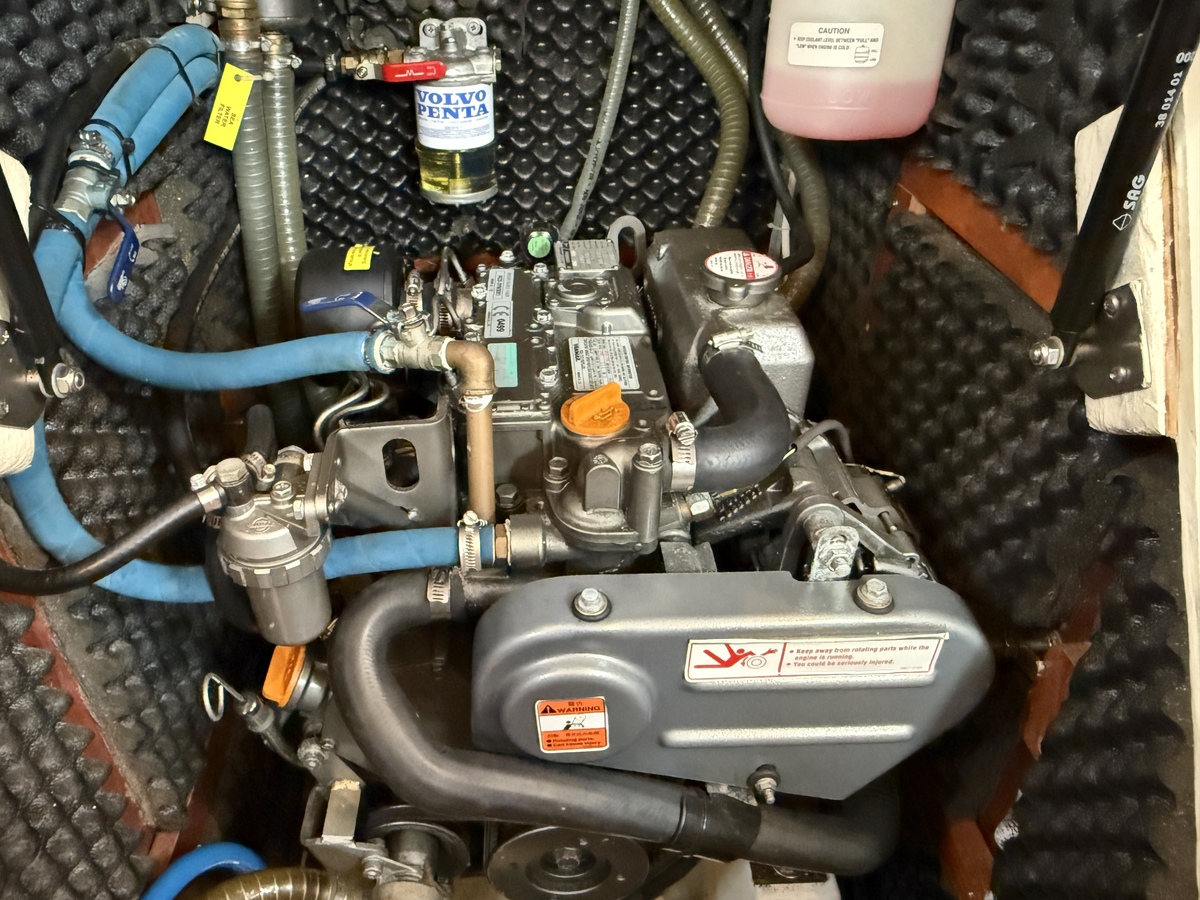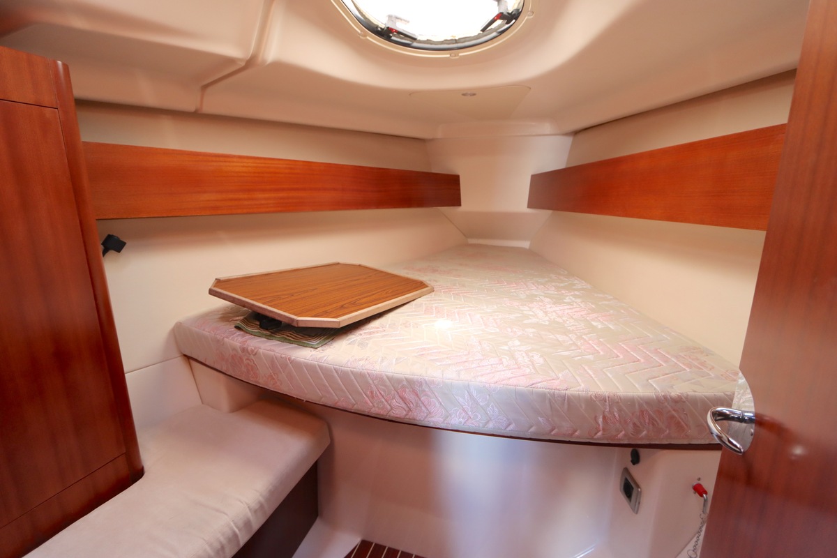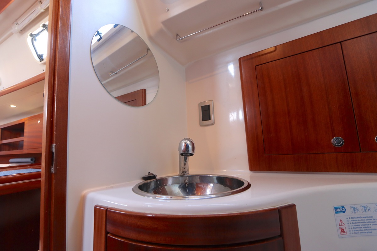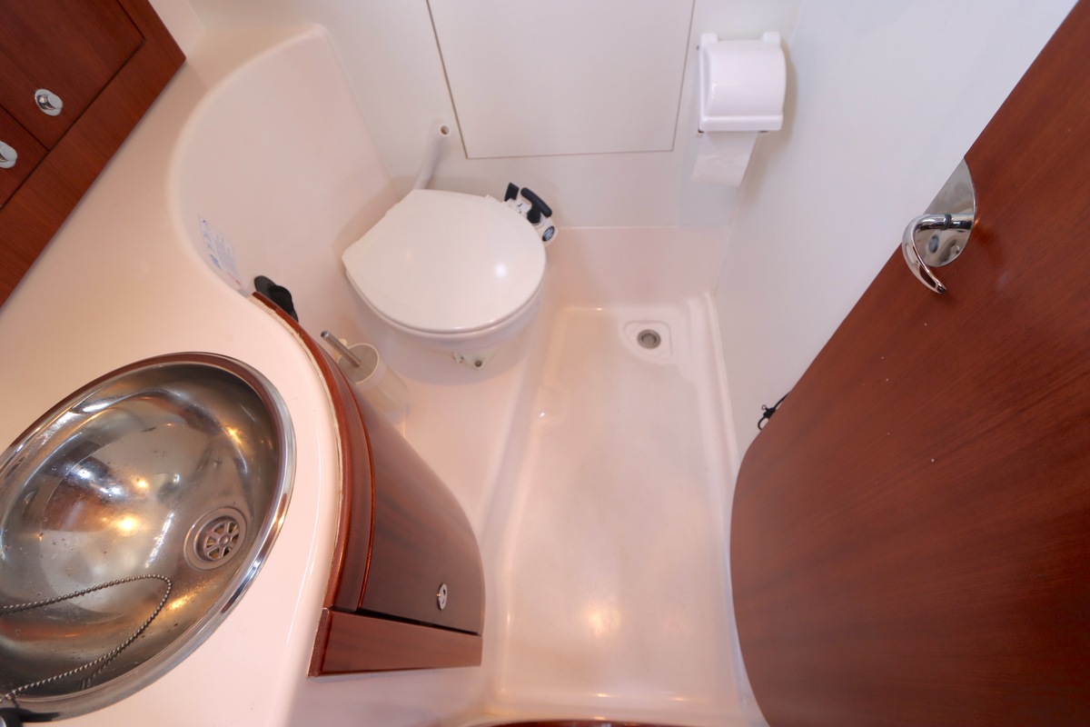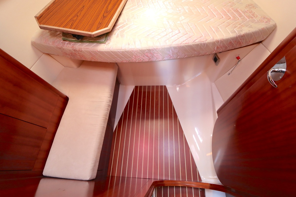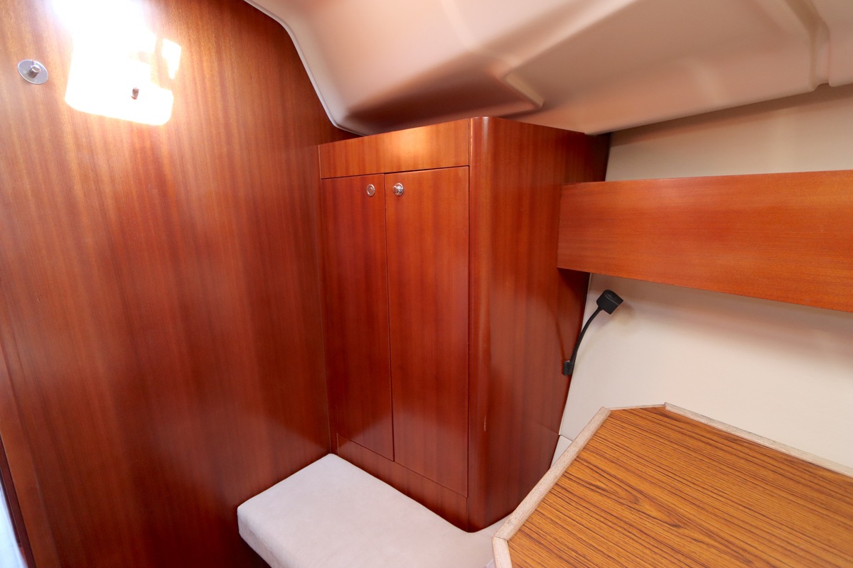 Der Innenraum ist geräumig und geschickt aufgeteilt, mit warmen Holzoberflächen und viel natürlichem Licht. Die Kabine bietet bequeme Kojen, eine gut ausgestattete Kombüse und einen gemütlichen Salon, was längere Reisen angenehm und praktisch macht.