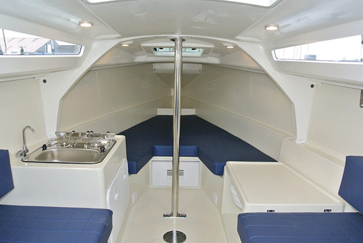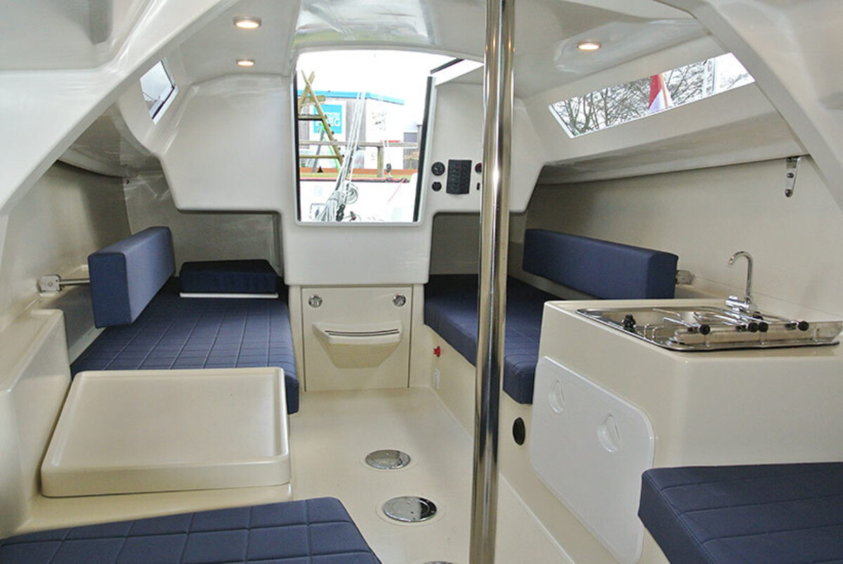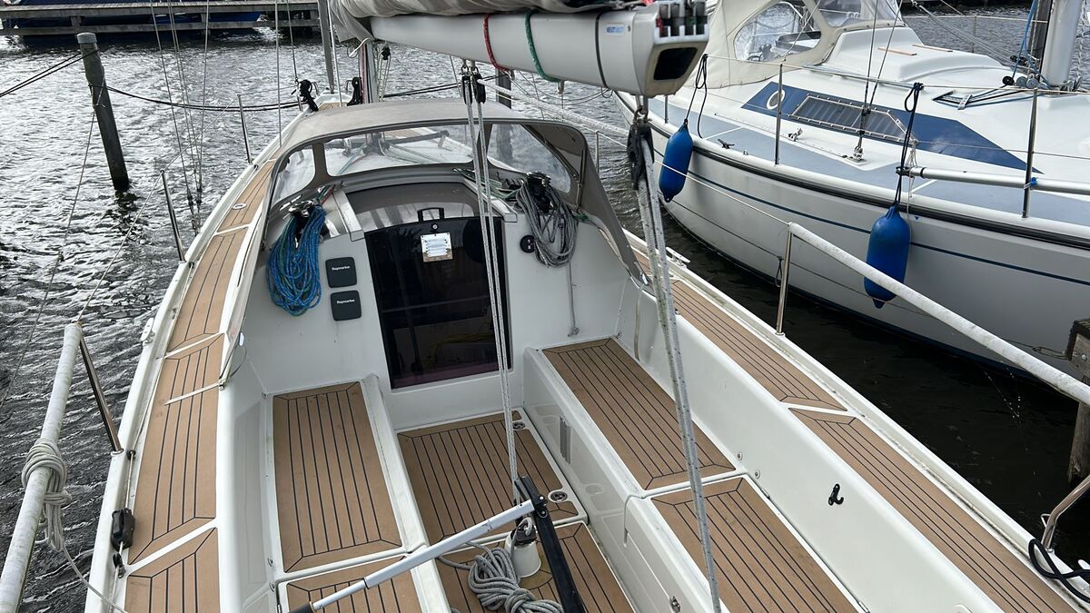 Segel: Dacron Performance Großsegel und Fock. Ebenfalls enthalten: Großbergungssystem mit Lazy Jacks, UV-Streifen an der Fock, Sprayhood, Reling, Badeleiter, Anker mit Festmacherleine, Flagge mit Mast und Halter, Kabinen-Relingsystem (Edelstahlseilsystem), Landstromanschluss, Raymarine i50 Geschwindigkeits-/Tiefen-/Log-Instrument, Raymarine i60 Anemometer, elektrische Winsch, Gaskocher, Spüle mit Wasserhahn und Wassertank, Kühlschublade (30 l), Toilette (manuelle Pumpe und Abwassertank), Tisch (für Kabine und Cockpit), Kabinenvorhänge und Cockpitpolster.
