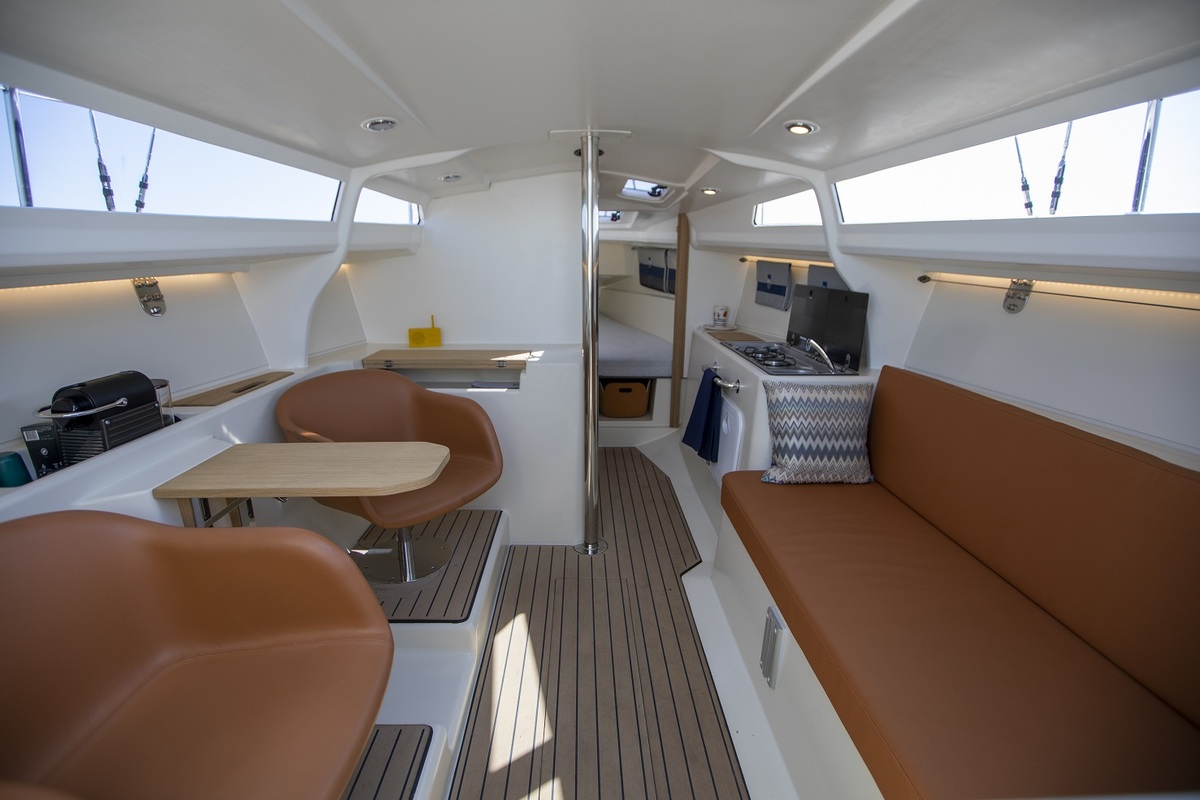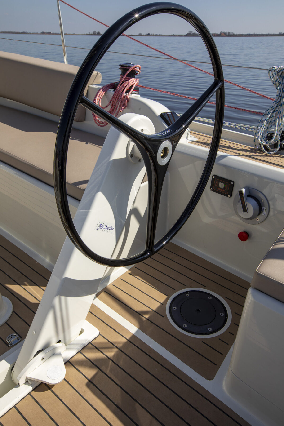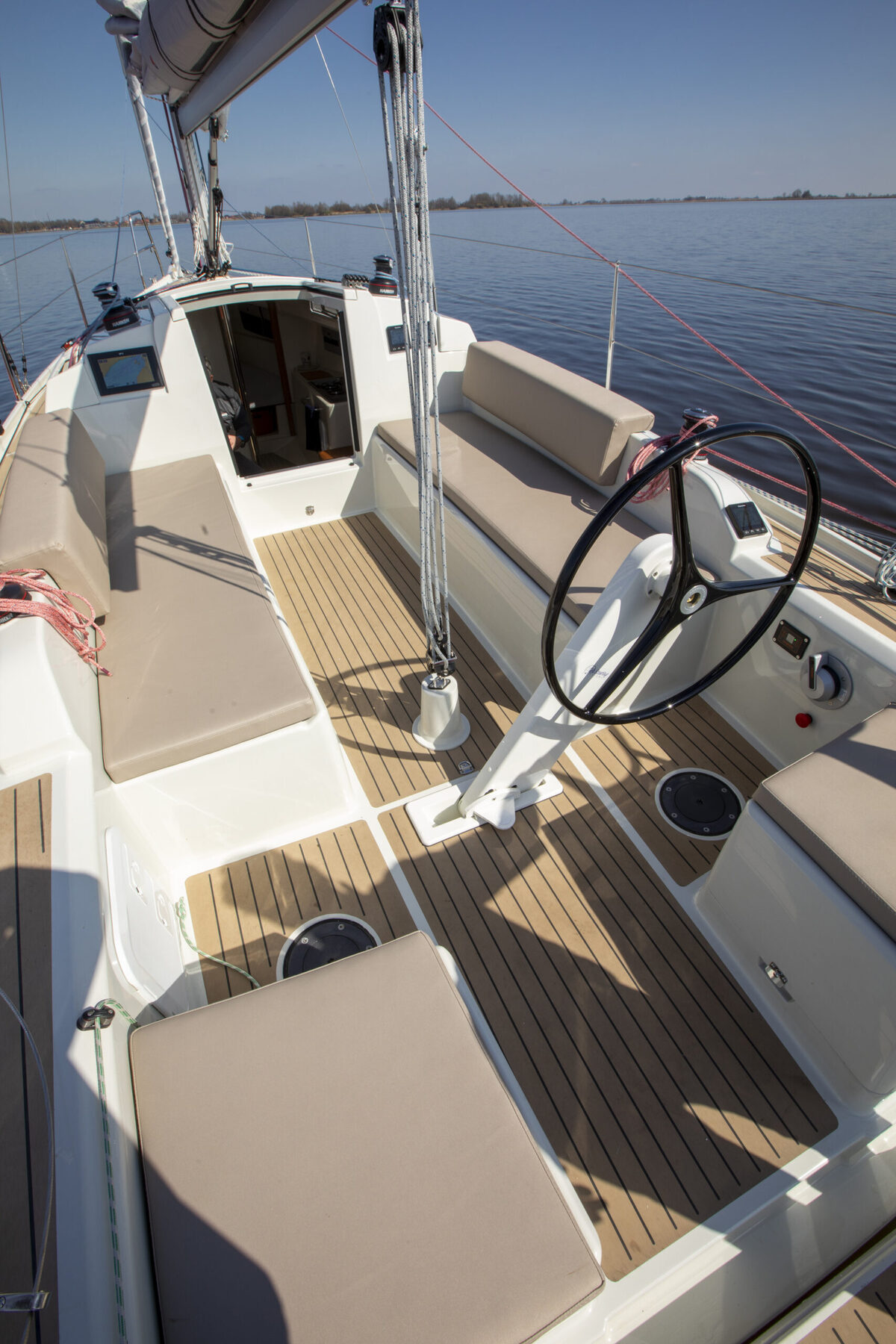 Wunderschöne, komplett ausgestattete Pointer 30. Dieses sehr gut ausgestattete Boot wurde in den letzten beiden Saisons als Vorführboot auf der Jachtwerf Heeg eingesetzt. Es verfügt über einen Torqeedo-Elektromotor (POD 6,0 kW) mit zwei Lithium-Batterien (48 V, 5000 Wh), die eine Reichweite von 5 Stunden ermöglichen. Die Segel sind aus hellgrauem CDX-Laminat gefertigt und bestehen aus einem Großsegel mit zwei Reffreihen sowie einer Rollgenua inklusive Großsegelbergung und Rollreffpersenning. Außerdem ist ein Code-0 mit Selden-Rollreffanlage vorhanden. Zur Ausstattung gehören ein drehbares Steuerrad, eine Badeplattform, eine faltbare Sprayhood und Cockpitpolster. Das Boot ist außerdem ausgestattet mit einer Reling, einer Badeleiter, einem Ultra-Anker, einem Flaggenmast, Landstromanschluss, Magnetkompass, Raymarine-Geschwindigkeits-, Tiefen- und Windmessern, Raymarine-Autopilot, Raymarine-Kartenplotter, Spüle, Zweiflammenkocher, 70-Liter-Frisch- und Abwassertanks, einem 50-Liter-Kühlschubfach, einer Toilette mit Handpumpe und einem Tisch (innen und außen). Das Deck ist vollständig mit Esthec (Kunstteak) belegt.