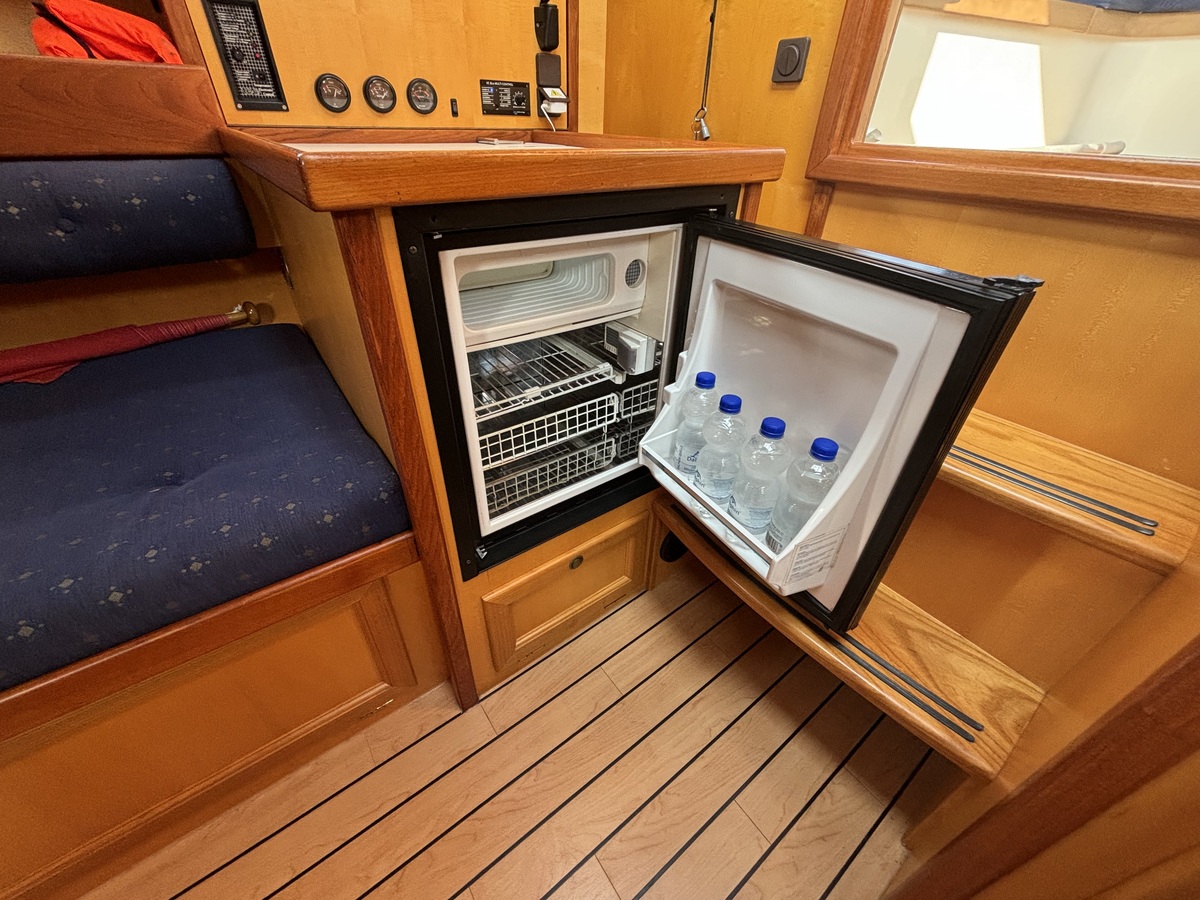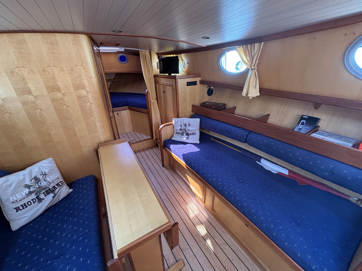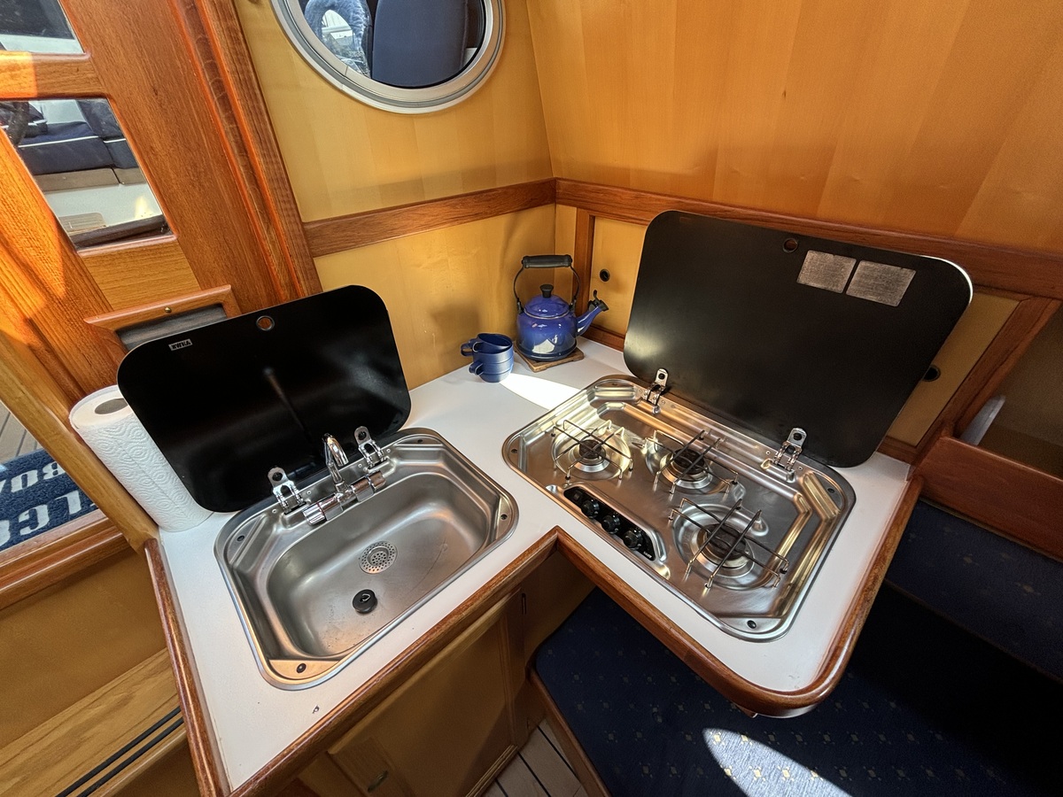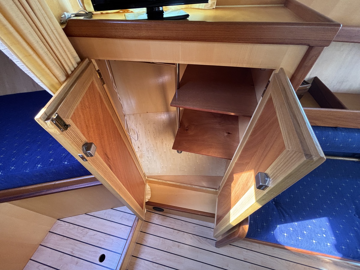 Dieses Motorboot ist bestens für lange Reisen und einen angenehmen Aufenthalt an Bord ausgestattet. Dusche, WC, Warmwasser, Konvektionsheizung und ein 230-V-Wechselrichter gehören zur Standardausstattung. Stehhöhe im gesamten Boot, eine geräumige Doppelkoje im Vorschiff und zwei breite Bänke im Salon bieten komfortable Unterkünfte für bis zu vier Personen.