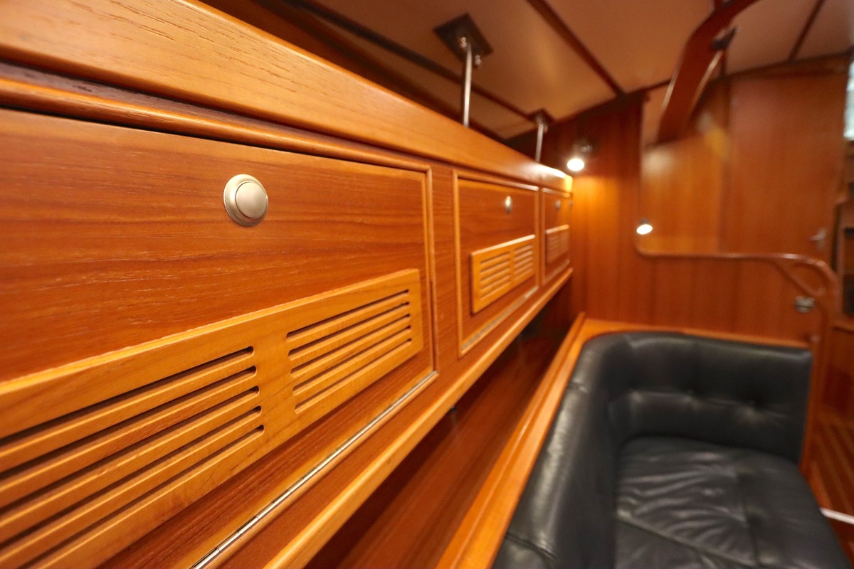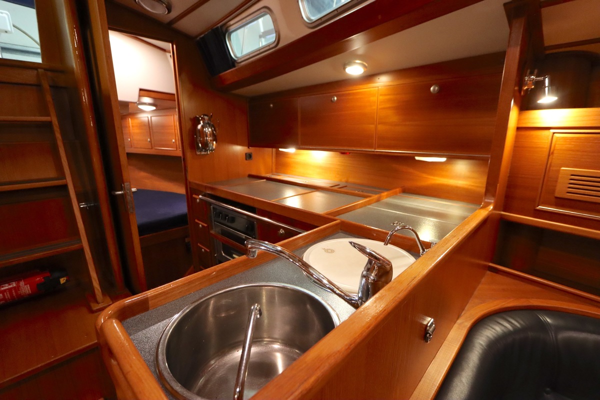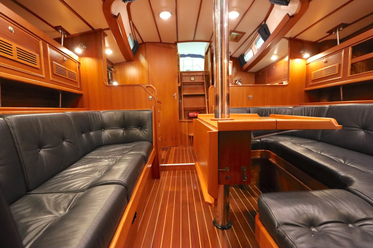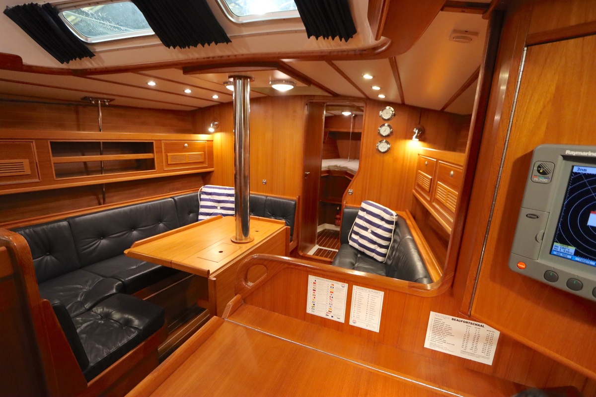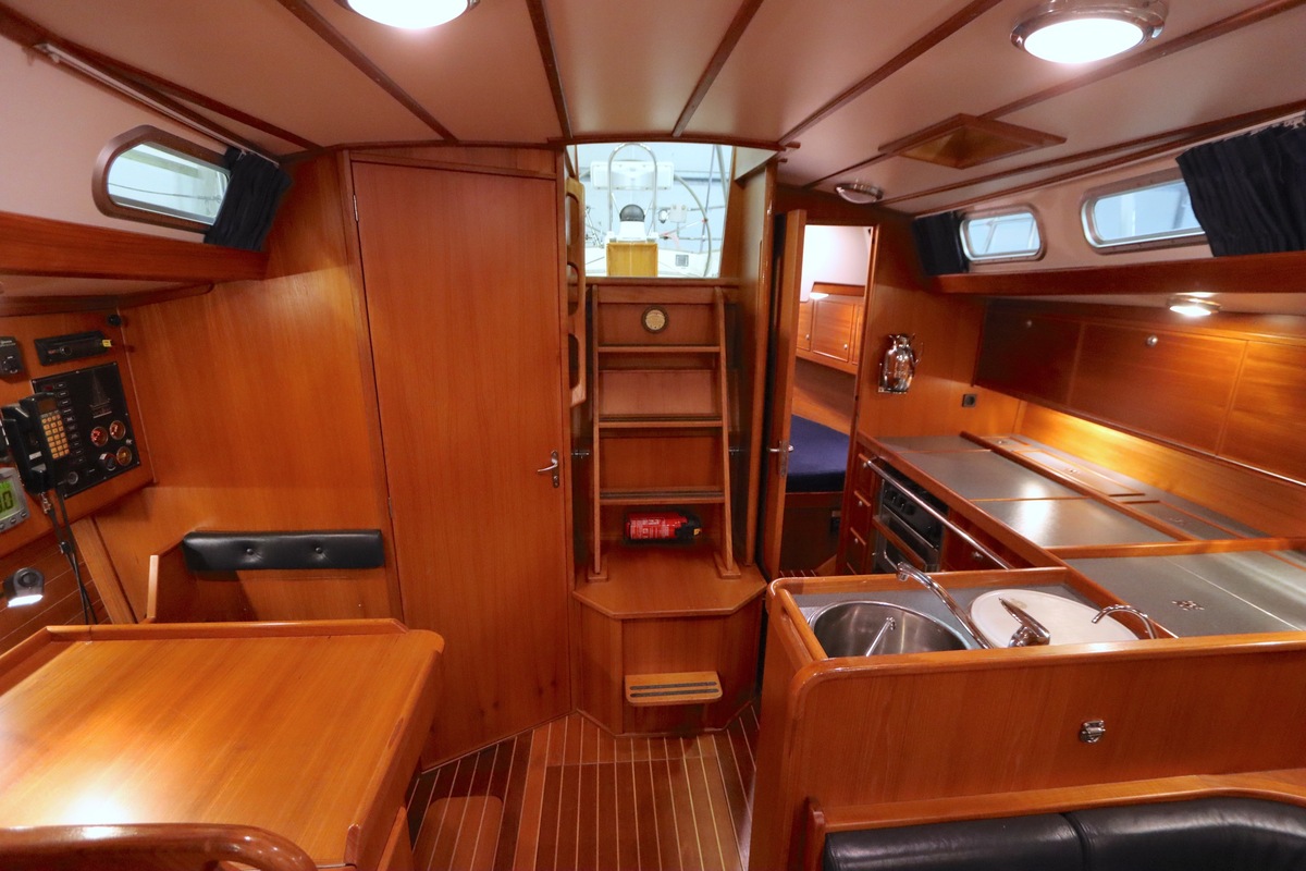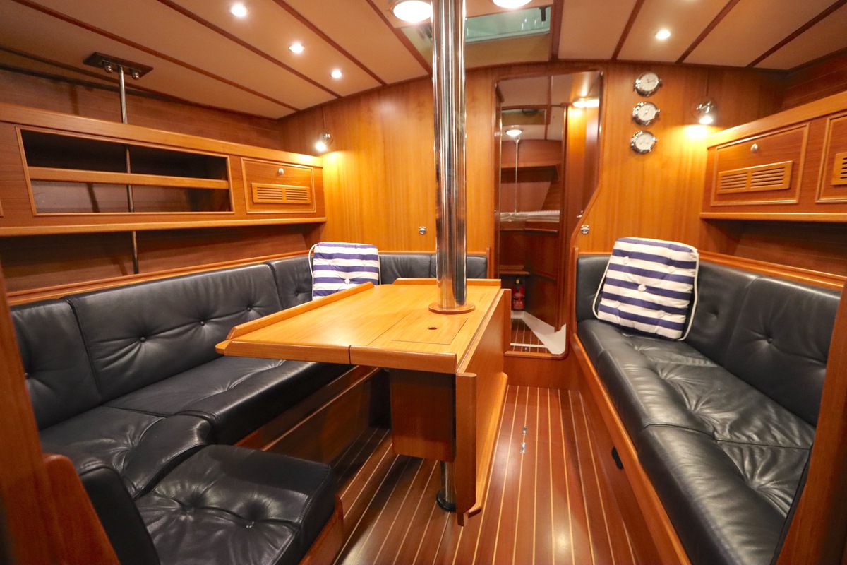 Im Inneren bietet die Yacht viel Platz und Kopffreiheit. Es gibt eine L-förmige Kombüse, eine Navigationsecke und eine gemütliche Sitzecke. Im vorderen Teil befinden sich eine Doppelkabine und eine Nasszelle; hinten eine zweite geräumige Kabine mit eigener Dusche und Toilette.