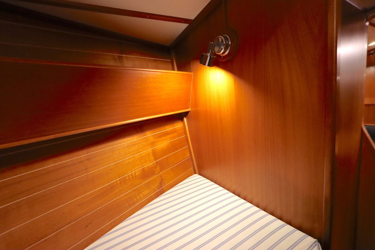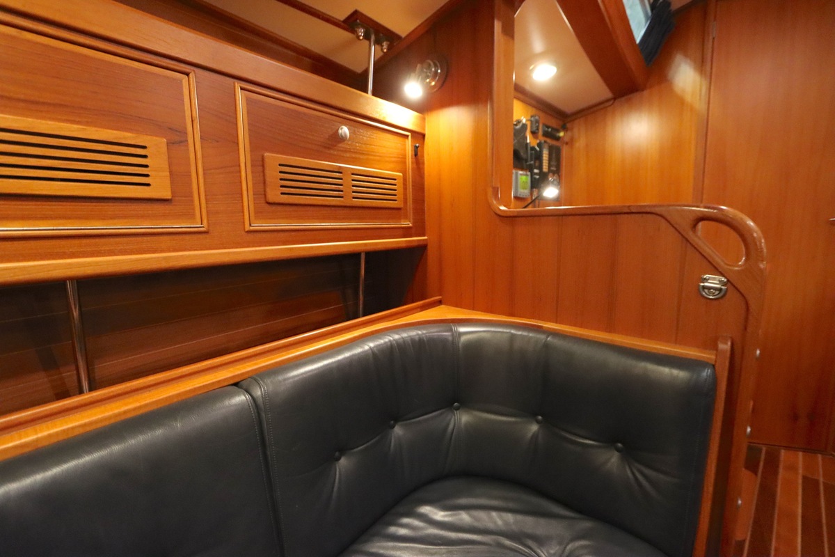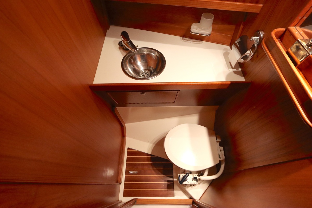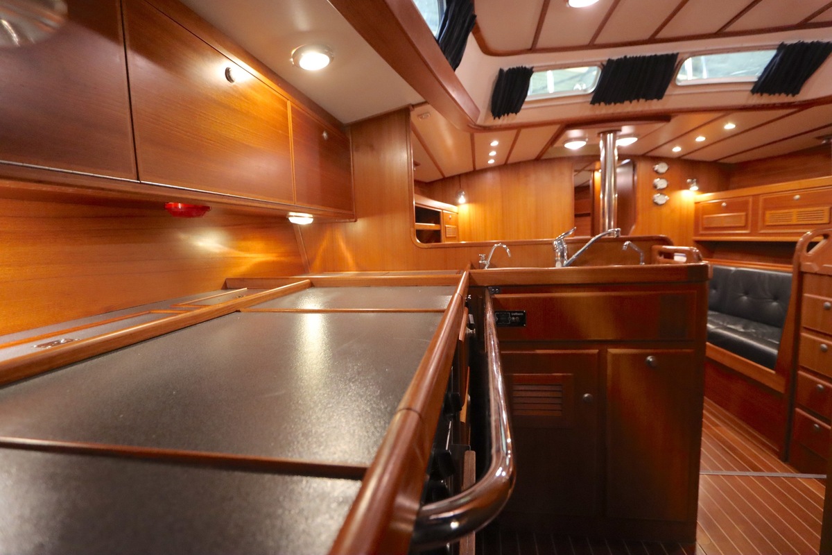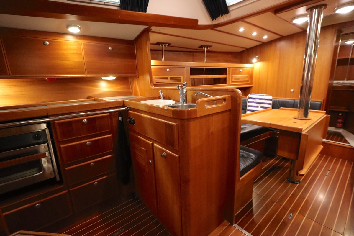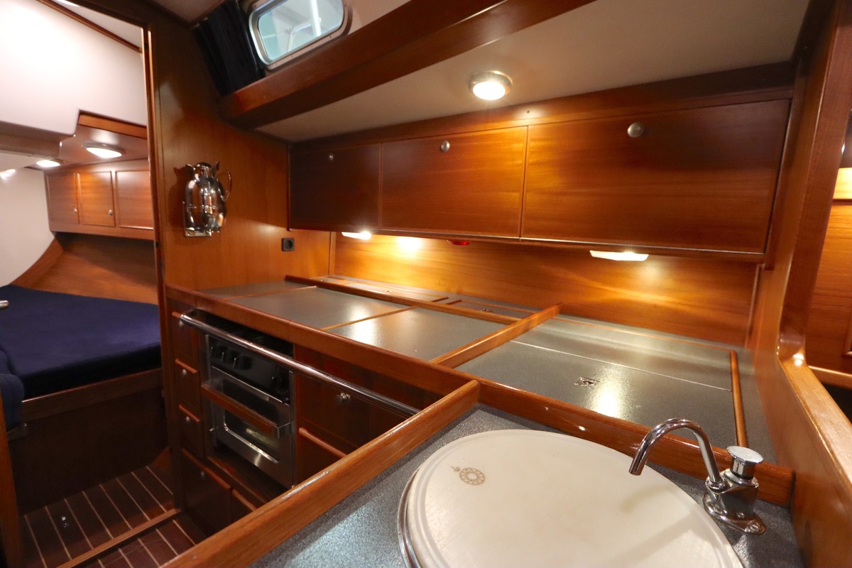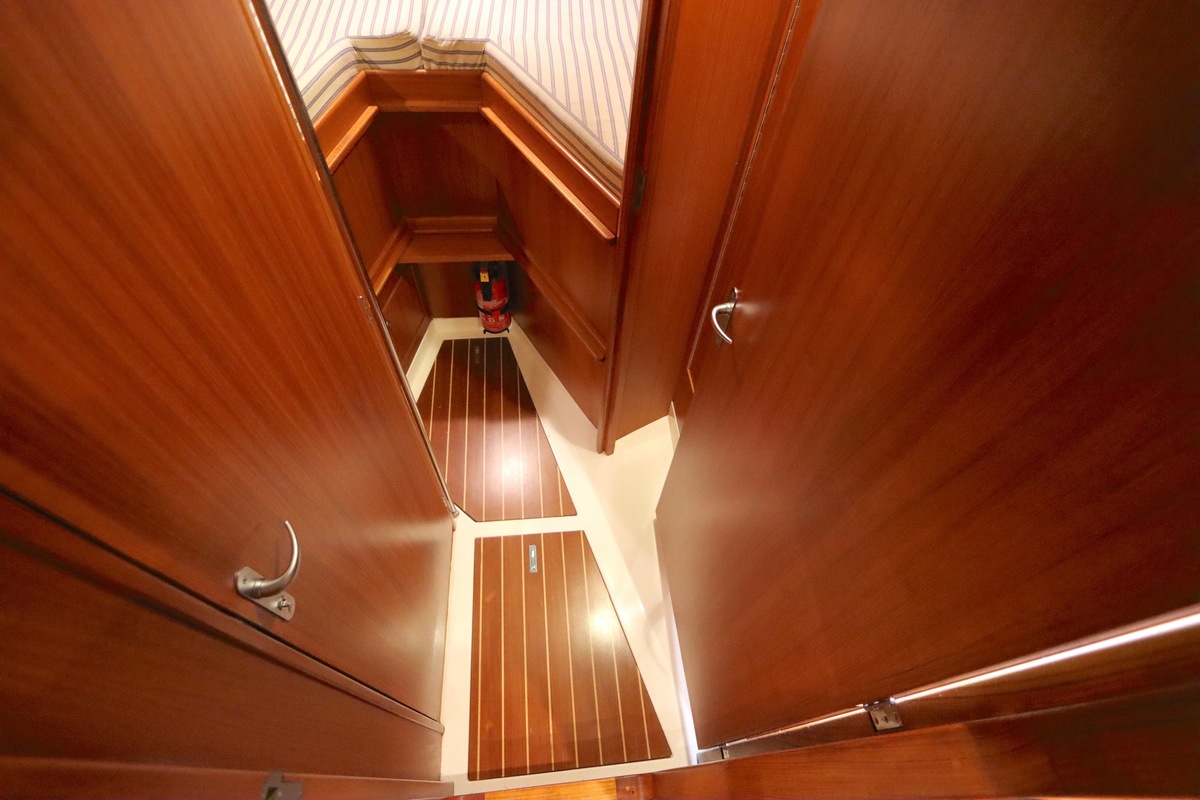 Im Inneren bietet die Yacht viel Platz und Kopffreiheit. Es gibt eine L-förmige Kombüse, eine Navigationsecke und eine gemütliche Sitzecke. Im vorderen Teil befinden sich eine Doppelkabine und eine Nasszelle; hinten eine zweite geräumige Kabine mit eigener Dusche und Toilette.
