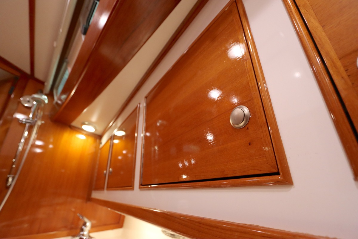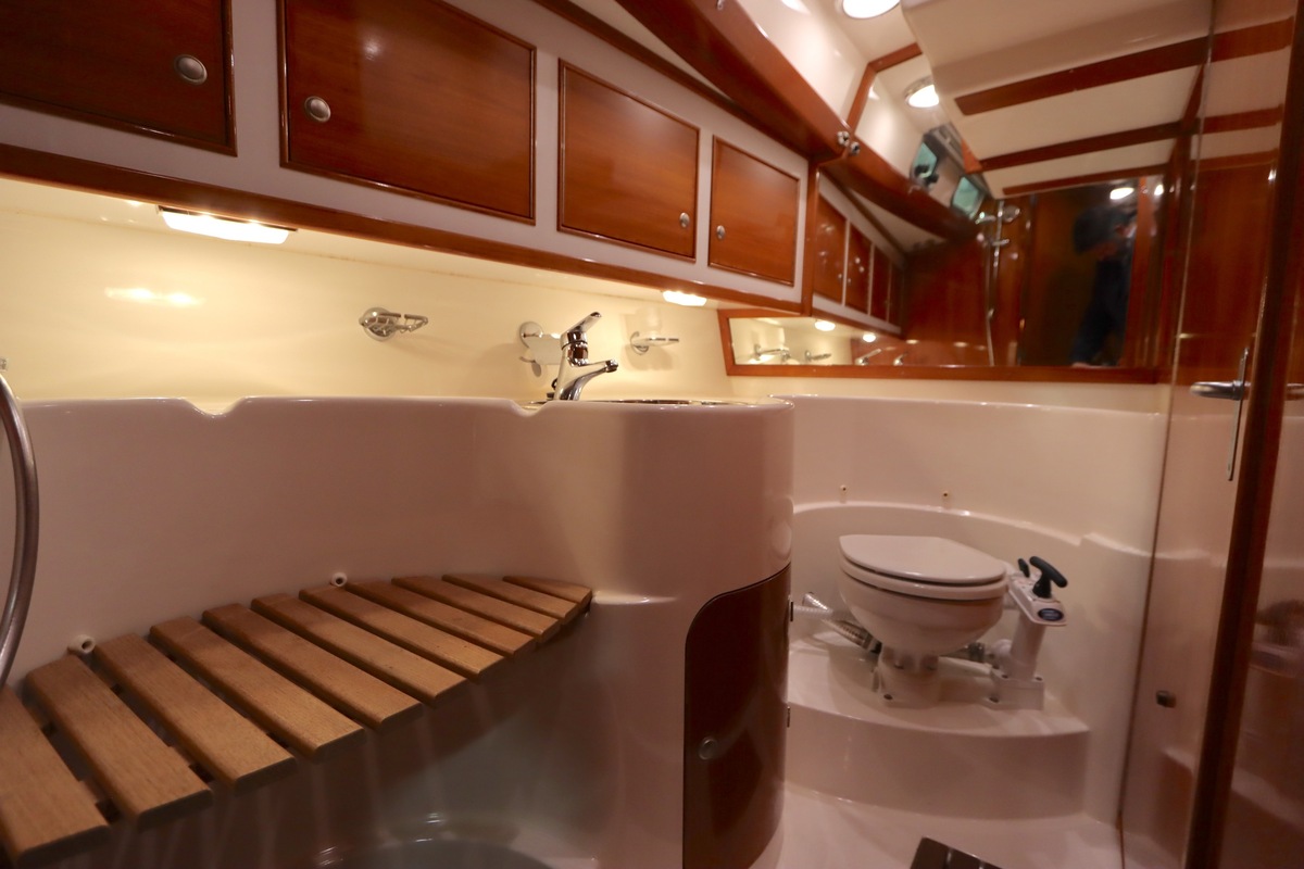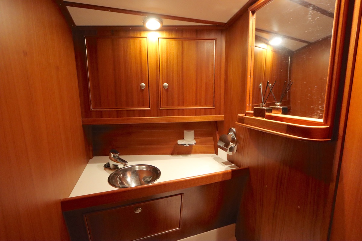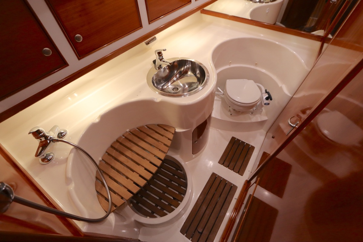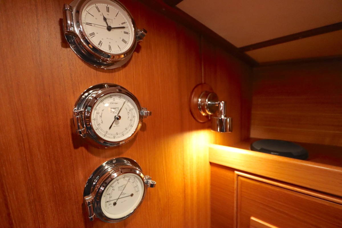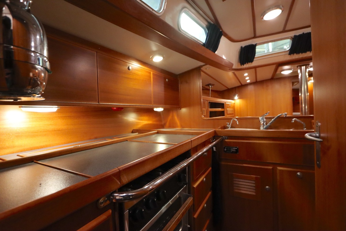 Im Inneren bietet die Yacht viel Platz und Kopffreiheit. Es gibt eine L-förmige Kombüse, eine Navigationsecke und eine gemütliche Sitzecke. Im vorderen Teil befinden sich eine Doppelkabine und eine Nasszelle; hinten eine zweite geräumige Kabine mit eigener Dusche und Toilette.