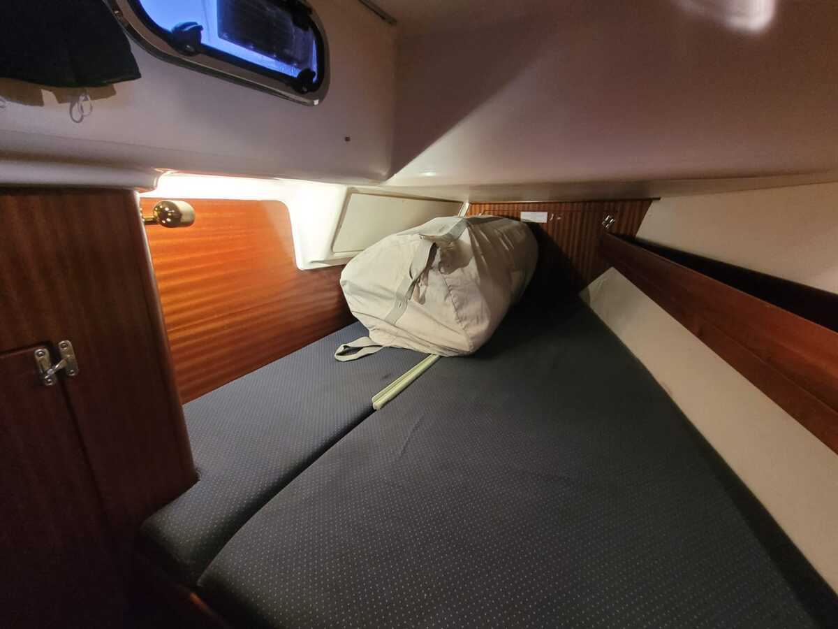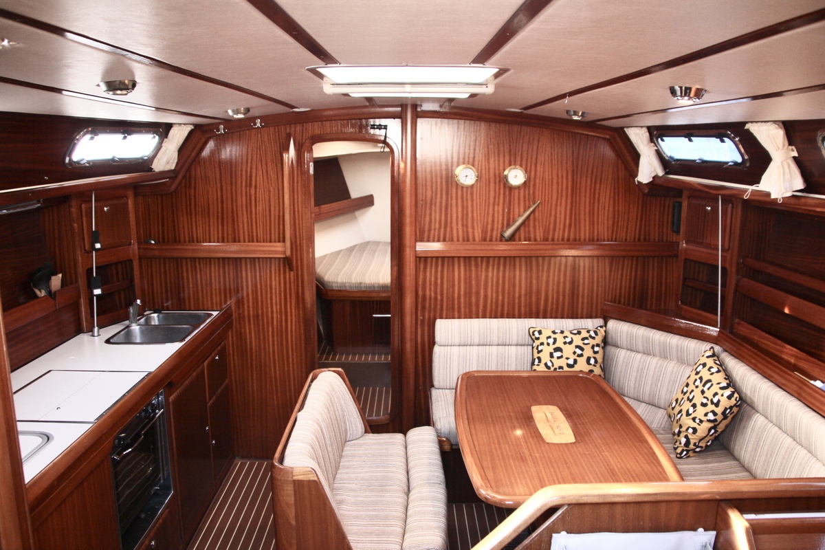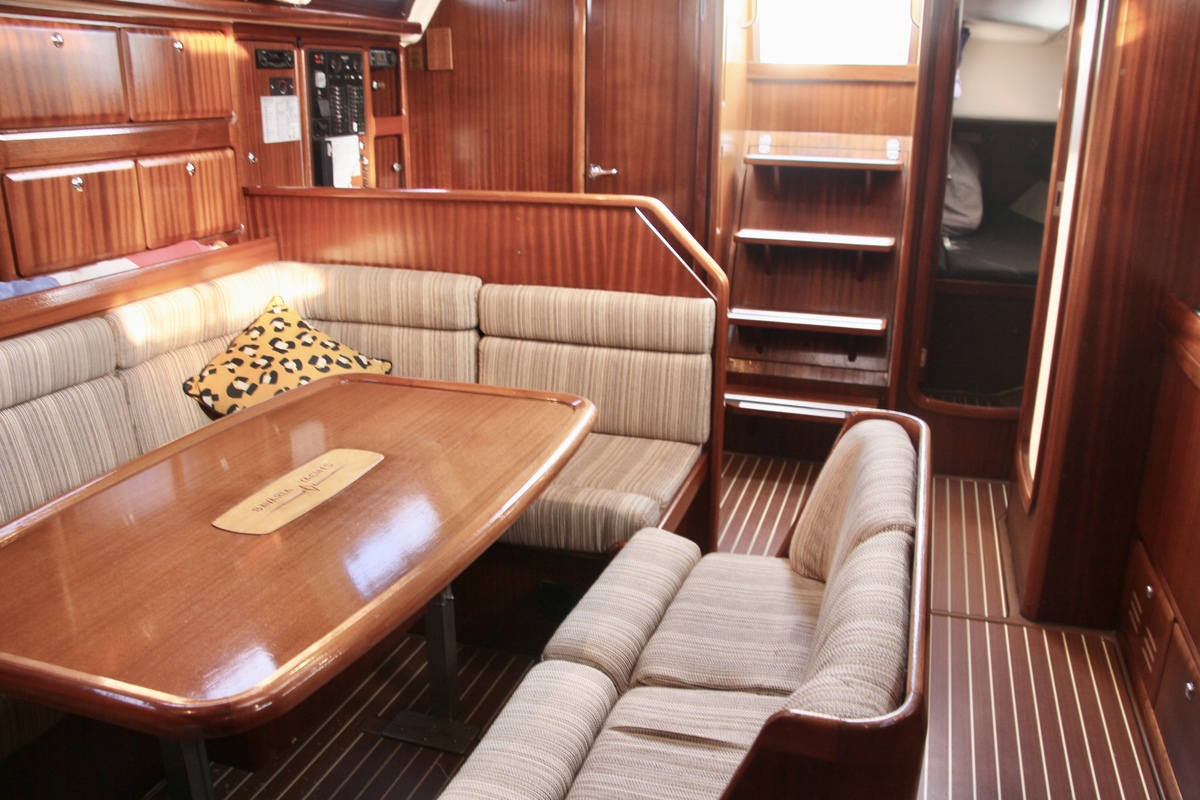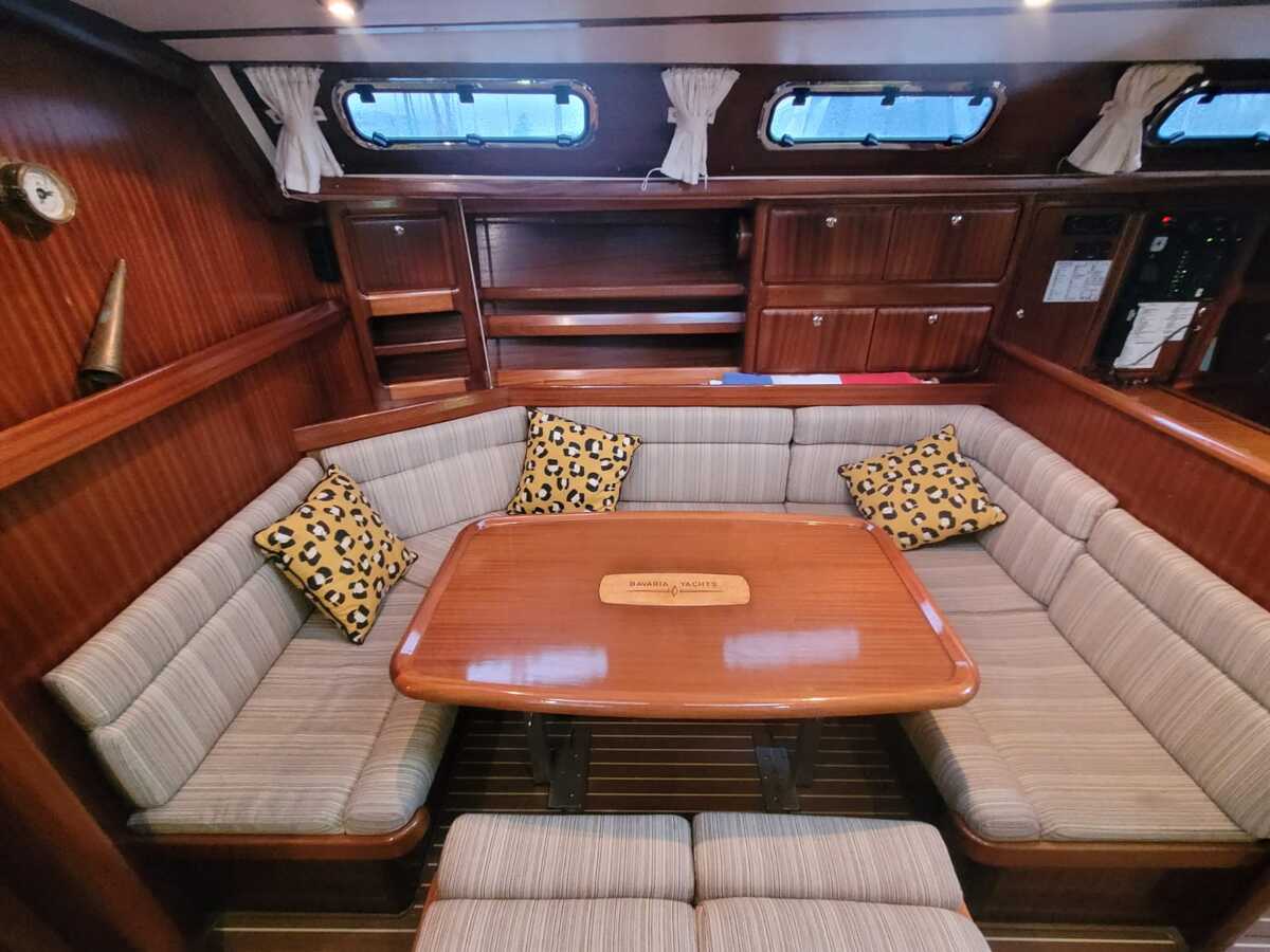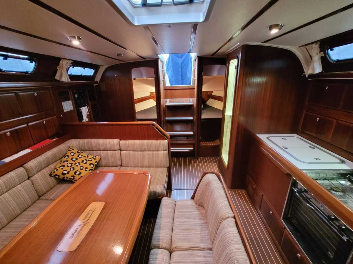 Die Bavaria 42-3 bietet ein helles und funktionales Interieur mit 200 cm Stehhöhe. Der Salon verfügt über einen gemütlichen Sitz- und Essbereich, drei Kabinen mit festen Kojen für sechs Personen sowie zusätzliche Kojen für vier Gäste. Klassische Holzelemente und die 2022 erneuerten gelb-braunen Polster sorgen für eine warme Atmosphäre. Die Pantry ist mit Gasherd, Backofen und elektrischem Kühlschrank ausgestattet, und die Webasto-Warmluftheizung trägt zum Komfort bei. Zwei manuelle Toiletten und eine Innendusche machen auch längere Aufenthalte an Bord, selbst mit Gästen, sehr angenehm.