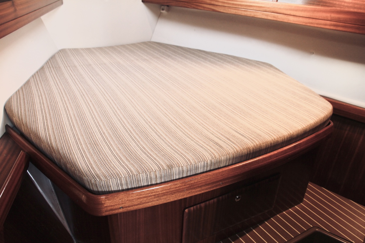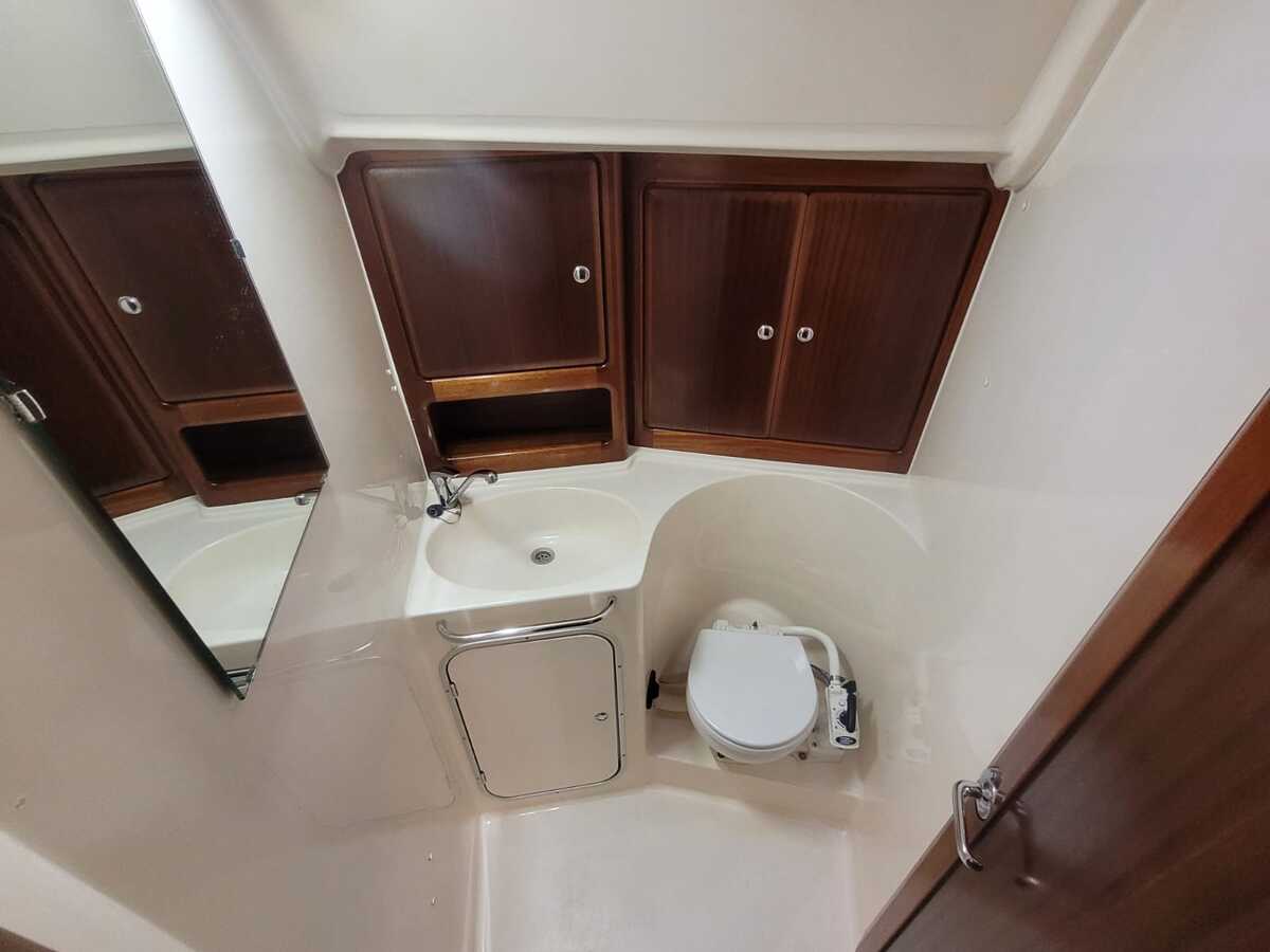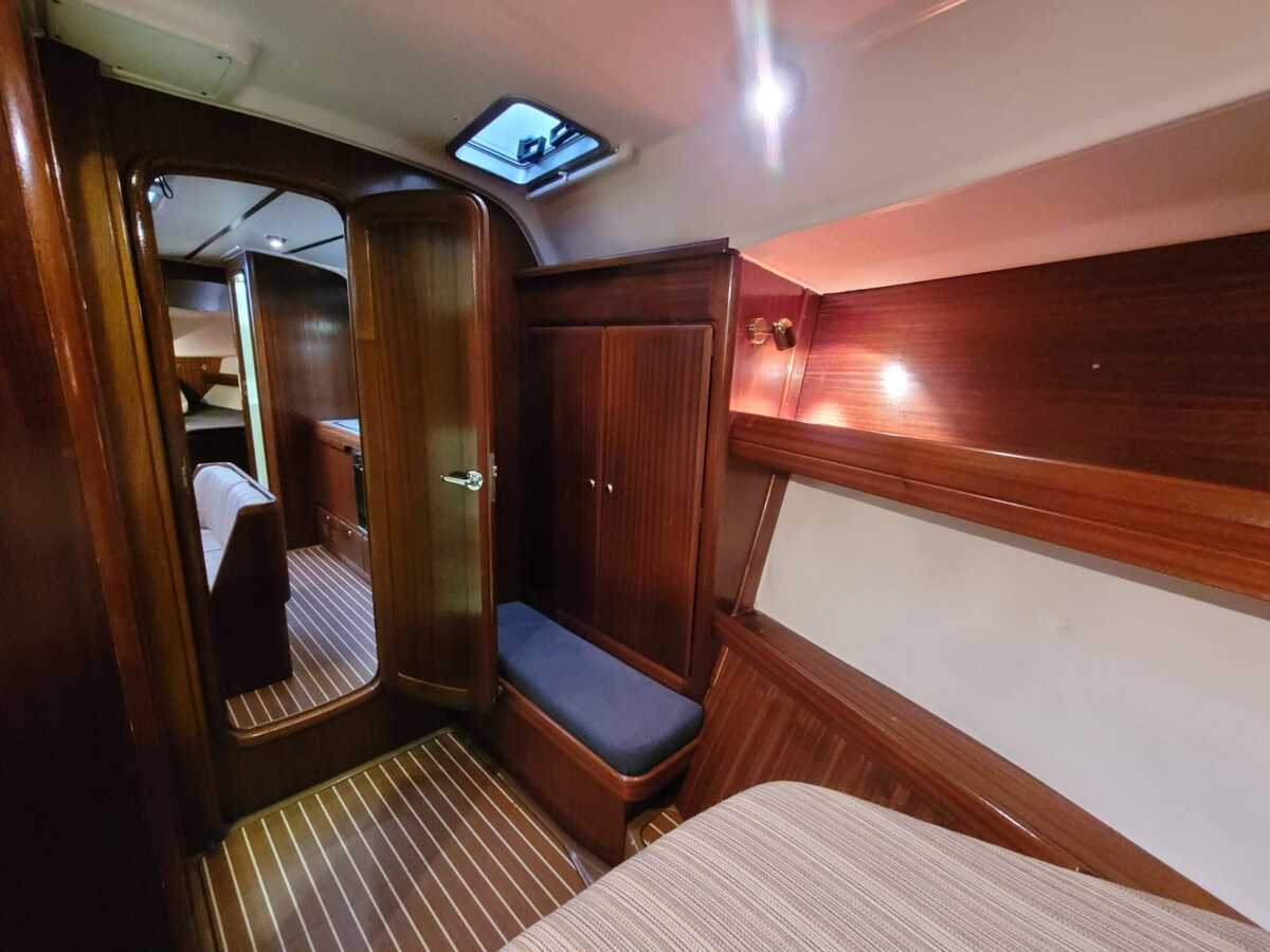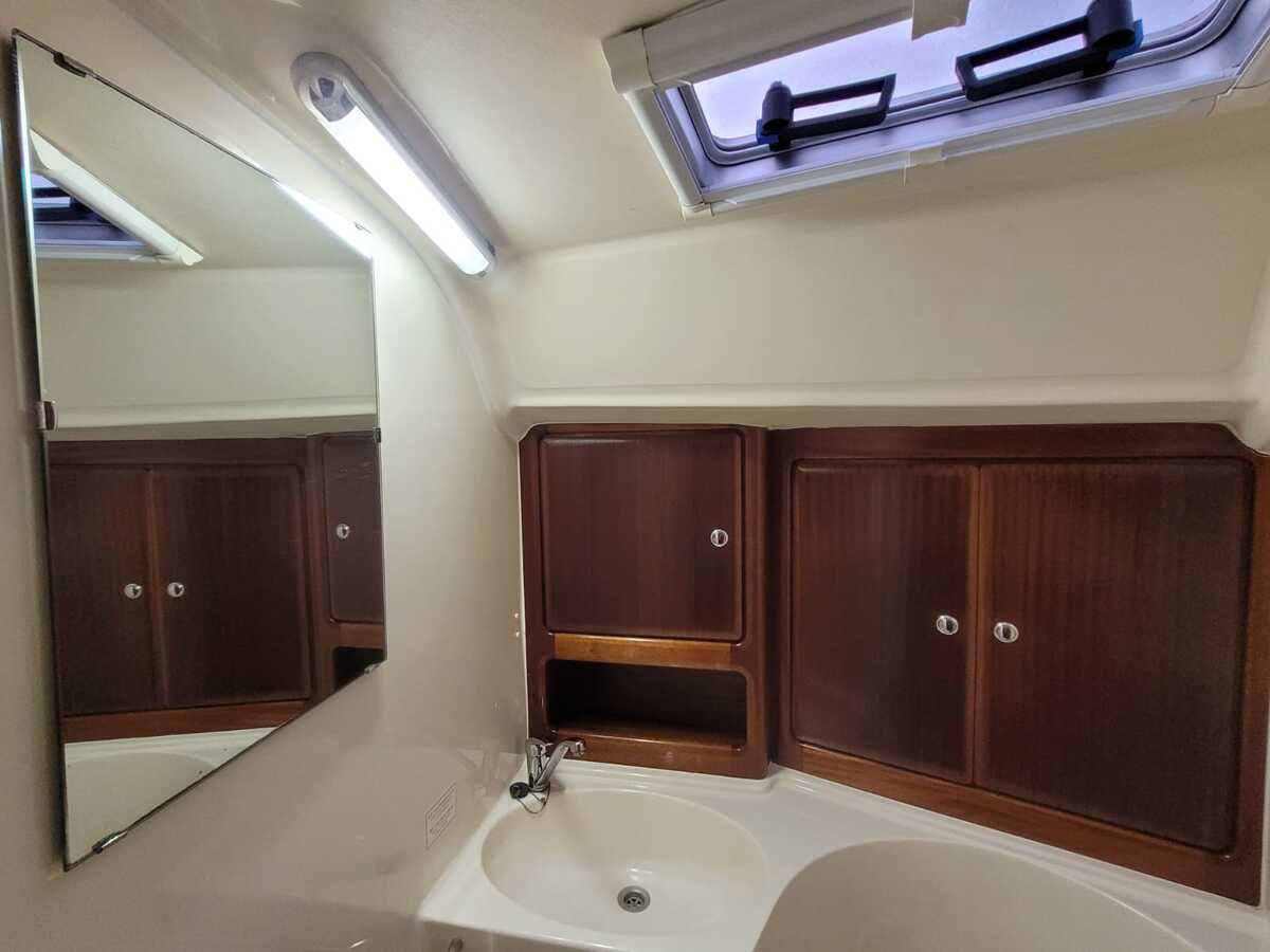 Die Bavaria 42-3 bietet ein helles und funktionales Interieur mit 200 cm Stehhöhe. Der Salon verfügt über einen gemütlichen Sitz- und Essbereich, drei Kabinen mit festen Kojen für sechs Personen sowie zusätzliche Kojen für vier Gäste. Klassische Holzelemente und die 2022 erneuerten gelb-braunen Polster sorgen für eine warme Atmosphäre. Die Pantry ist mit Gasherd, Backofen und elektrischem Kühlschrank ausgestattet, und die Webasto-Warmluftheizung trägt zum Komfort bei. Zwei manuelle Toiletten und eine Innendusche machen auch längere Aufenthalte an Bord, selbst mit Gästen, sehr angenehm.