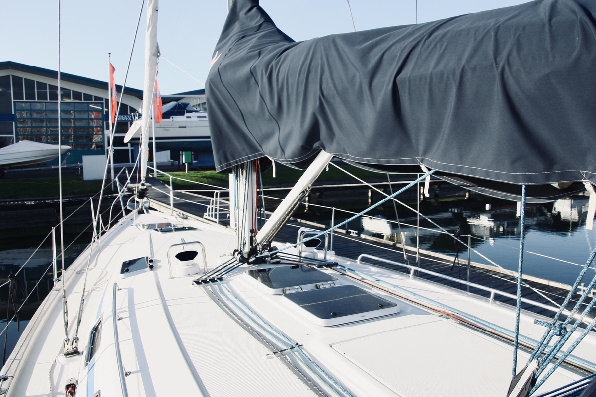 Segeltechnisch ist diese Bavaria-Yacht ein Traum. Sie verfügt über ein Fractional-Rigg auf einem Aluminiummast mit Rod-Rigg, ein Elvström-Großsegel (2020, 43,4 m²), eine zweite Genua (2021, 56 m²), eine Fock (2021, 40,7 m²) und einen Gennaker. Die Furlex-30-Rollreffanlage und die manuellen Harken-Selbstholwinschen erleichtern das Handling.