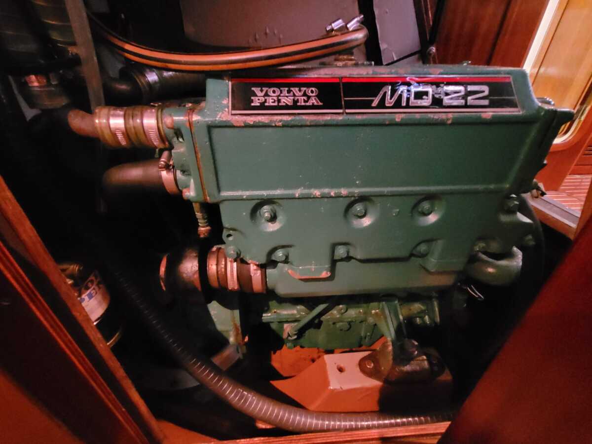 Der zuverlässige Volvo Penta MD22 L Dieselmotor (50 PS) mit Saildrive und Faltpropeller ermöglicht eine komfortable Reisegeschwindigkeit von 6–7 Knoten. Der Motor wurde kürzlich gewartet, inklusive des Austauschs der Saildrive-Hülse (2022).