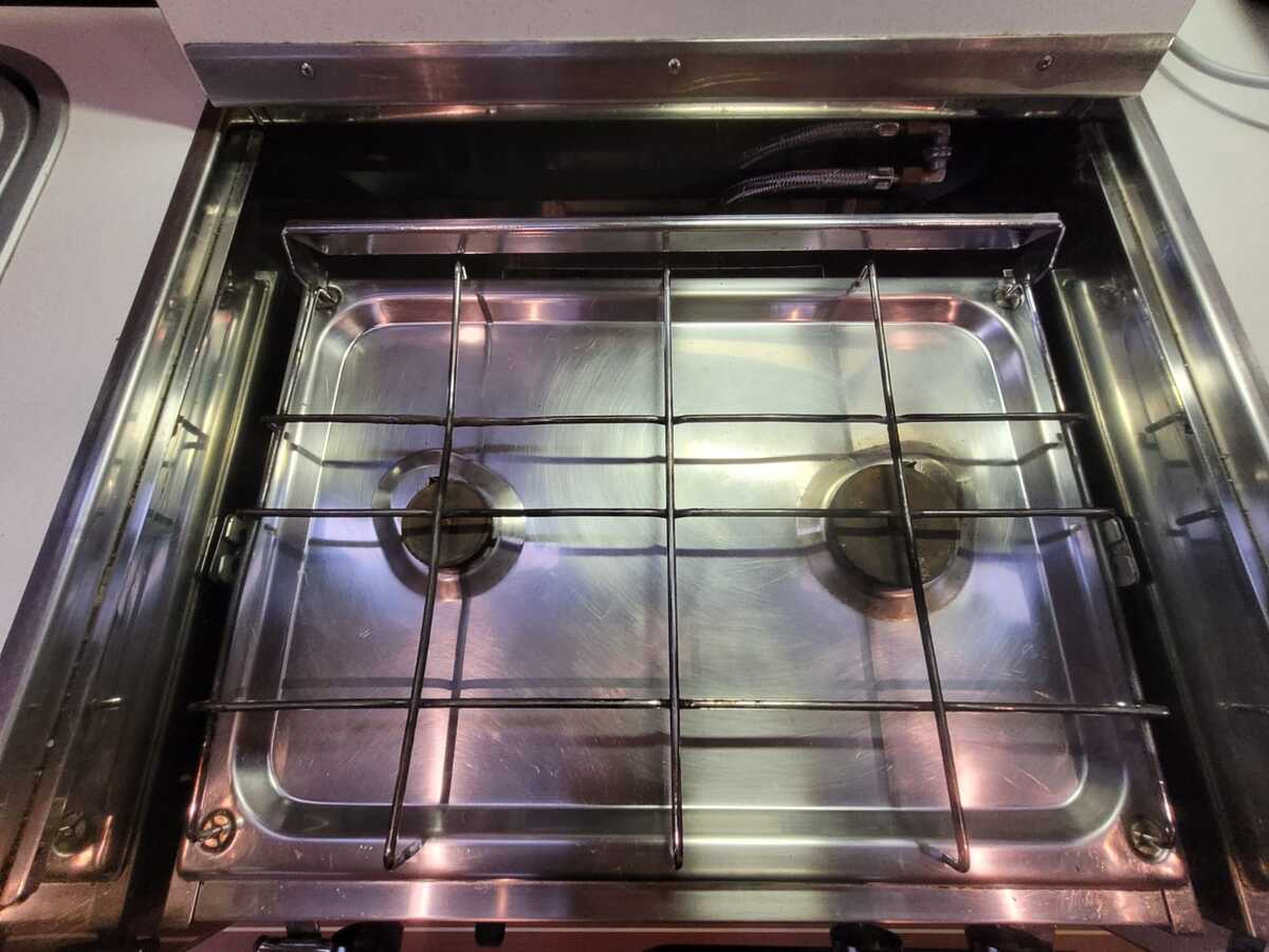 2-Flammen-Gasbrenner, flexible, umflochtene Edelstahl-Gasleitung (Alter unbekannt)